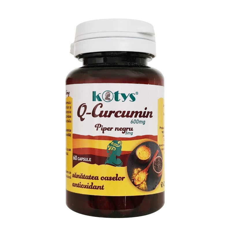 Capsulele Q-Curcumin 600mg cu Piper Negru de la Kotys este un supliment alimentar natural cu o concentrație ridicată de curcumină, un compus activ din turmeric cu proprietăți antiinflamatoare și antioxidante semnificative. Formula sa îmbunătățită cu piper negru crește absorbția curcuminei în organism, oferind o gamă largă de beneficii pentru sănătate: